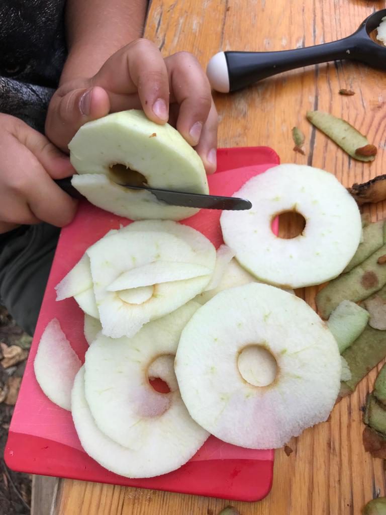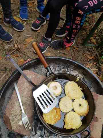 Eine ordentlich Menge wird allerdings aus der Hand in den Mund direkt verzehrt. Ein paar Kilo werden geschält und zu Apfelringen geschnitten. Sie kommen in Pfannkuchenteig, dann in die gusseiserne Pfanne auf unserer Feuerstelle und danach werden sie mit Zucker bestäubt. Eine nicht endende Schlange Kinder bildet sich an der „Ausgabestelle“, die Marie strengstens kontrolliert. Schließlich sollen alle gleich viele „Apfelkichle“ bekommen.