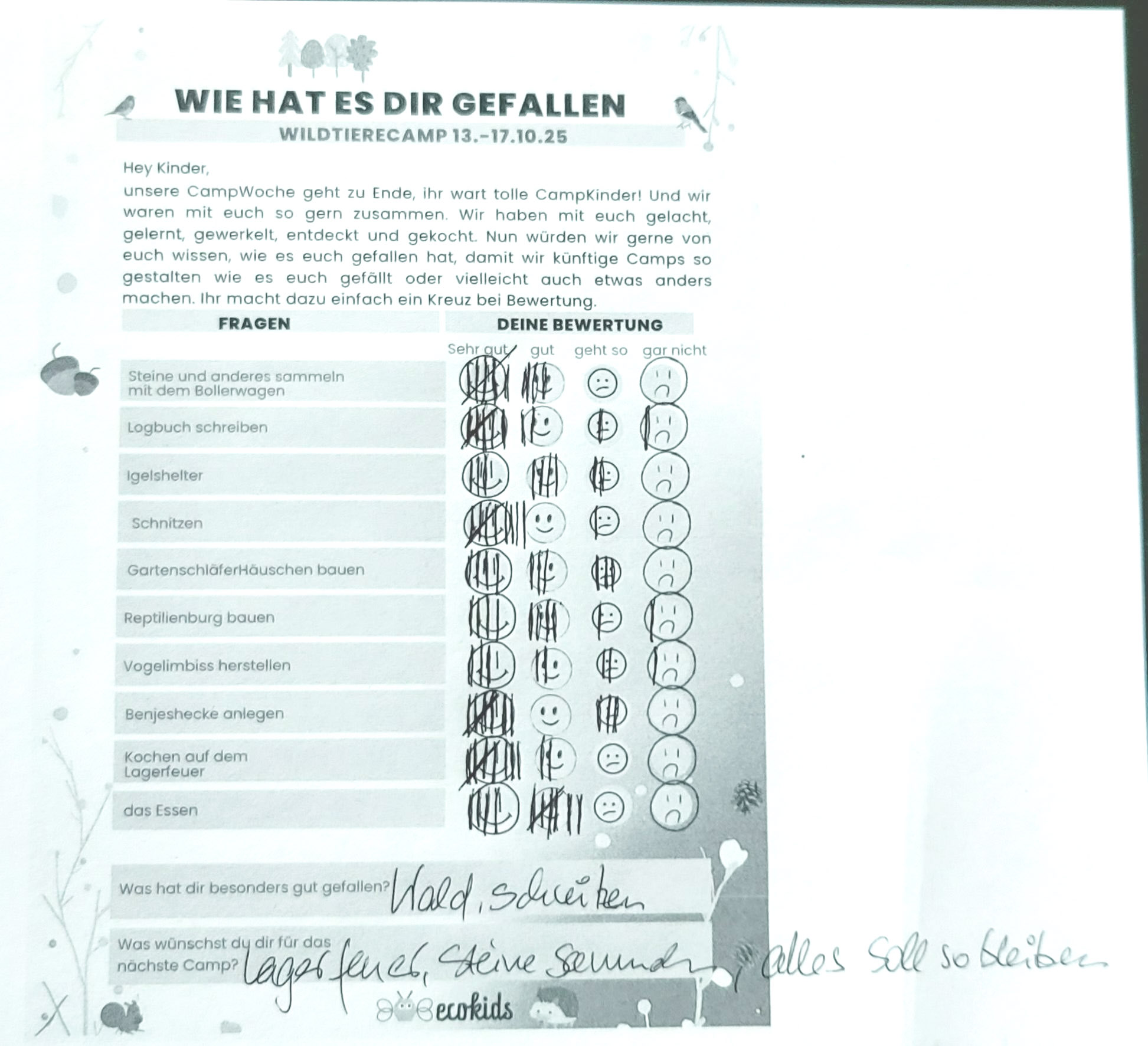 - Kochen am Lagerfeuer, Walderkundung und Barfußpfand sind auf Platz 4 mit 14 Smileys