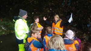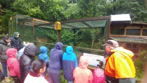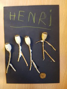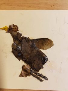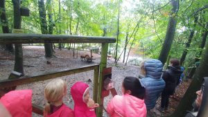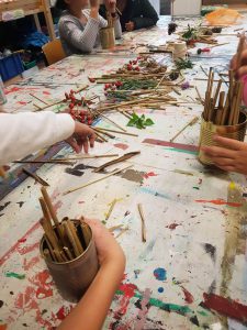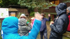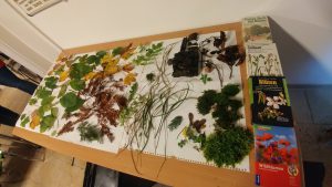Ziemlich durchnässt angekommen, führt uns Herr Nesemann durch die Anlage, erklärt die Vorteile der Moderlieschen* in einem Teich, macht uns mit einem europäischen Nerz bekannt (Man muss sich vorstellen, dass aus diesen possierlichen Tierchen einmal beliebte und teure Mäntel hergestellt wurden.) und den Kamerunschafen*. Drinnen in der Waldschule entstehen aus unseren gesammelten Naturmaterialien Karten, die man gut und gerne als Glückwunsch- oder Grußkarten verwenden kann.