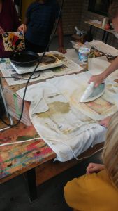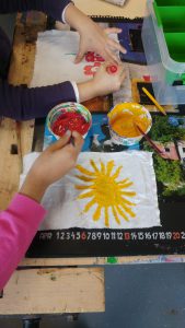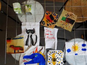Es entstehen gemalte Bienenwachstücher zum plastikfreien Verpacken von Lebensmitteln.