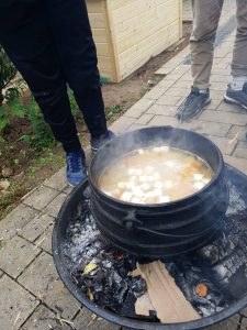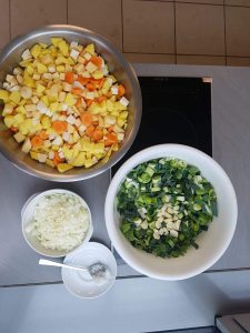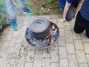 Mittagessen selber machen! Die letzten vier Tage haben fleißige Helfer uns mittags aufs Beste versorgt. Heute gibt es Karotten-Kartoffel-Knoblauch-Lauch-Petersilienwurzel-Sellerie-Steckrüben-Topinambur-Zwiebel-Eintopf aus dem Feuertopf mit einer Gremolata von Petersilie, Brennnessel und geriebener Zitronenschale. Selbstgemacht!